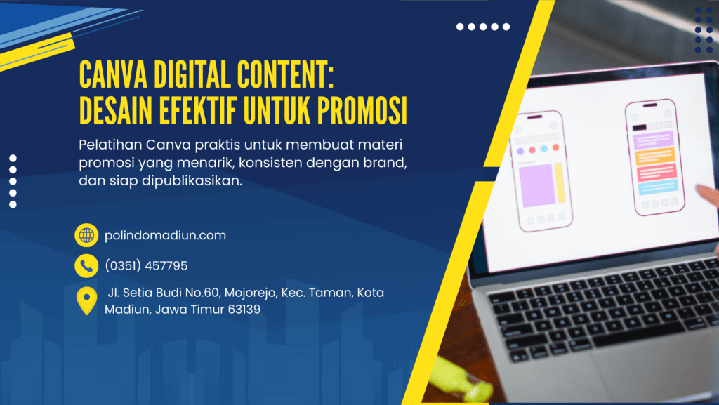 Canva Digital Content: Desain Efektif untuk Promosi membantu pelaku usaha, pemasar, dan kreator membuat materi promosi yang menarik dan efektif. Program ini membimbing peserta memanfaatkan fitur Canva secara praktis sehingga mereka menghasilkan konten yang konsisten, cepat diproduksi, dan siap dipublikasikan di berbagai platform.