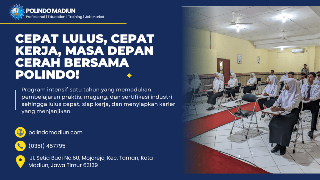 Dengan demikian POLINDO menawarkan jalur cepat menuju karier melalui program satu tahun yang praktis dan terarah. Kunjungi Kampus Polindo Madiun Jl Setia Budi No 60 Mojorejo Kec Taman Kota Madiun Jawa Timur 63139 untuk informasi pendaftaran dan konsultasi.