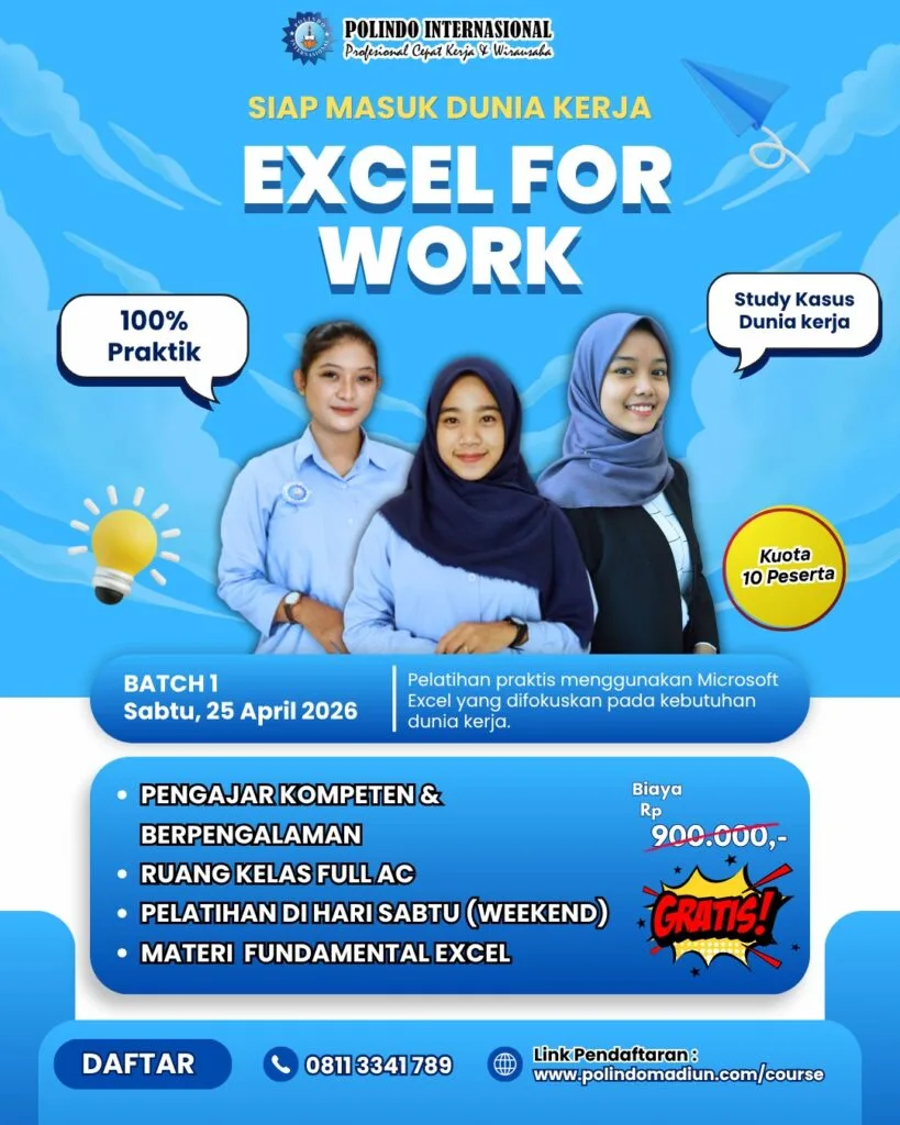 Polindo Training Center hadir sebagai lembaga kursus dan pelatihan yang berlokasi di Jl. Setiabudi No. 60, Kota Madiun. Kami merupakan lembaga kursus resmi di kota Madiun dengan nomor izin operasional XXX/XX.XX/401.101/2023 bekinerja Baik di bawah binaan Direktorat Kursus dan Pelatihan, berdasarkan SK Nomor XXX/XX.XX/SK/2024. Selain itu, kami juga merupakan Lembaga Pelatihan Kerja terakreditasi, di bawah binaan (LA-LPK) dengan SK Nomor XXX/LALPK/XII/2024. Sebagai pelatihan kerja modern, guna membentuk sumber daya manusia yang Terampil, Kompeten, Siap bersaing di dunia kerja modern. Kami menyiapkan instruktur atau pengajar berkompeten yang tersertifikasi nasional dan kami menyediakan kebutuhan anda untuk mengikuti kursus atau pelatihan kelas pagi, siang, sore, malam dan weekend.