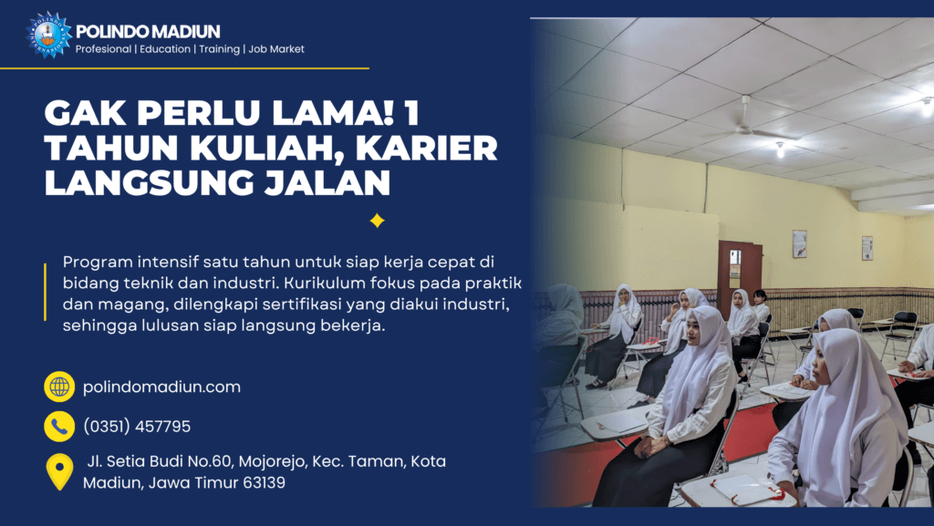 Dengan prinsip gak perlu lama, POLINDO membuka jalur cepat menuju karier melalui program satu tahun yang praktis dan terarah. Kunjungi Kampus Polindo Madiun Jl Setia Budi No 60 Mojorejo Kec Taman Kota Madiun Jawa Timur 63139 untuk informasi pendaftaran dan konsultasi.