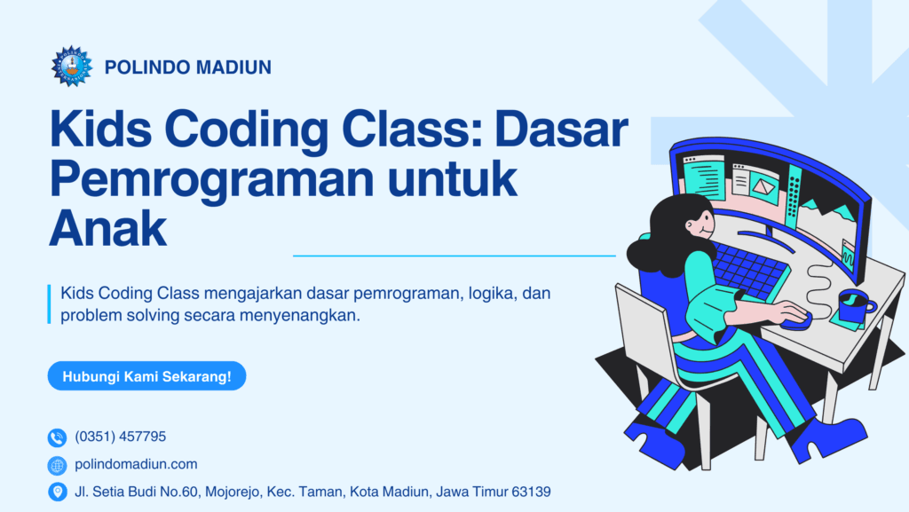 Kids Coding Class di Kampus Polindo Madiun mengajak anak belajar membuat situs web dengan cara menyenangkan dan terstruktur. Program ini menekankan praktik langsung sehingga peserta segera melihat hasil kerja mereka di browser. Selain itu, pengajar membagi materi secara bertahap dan memakai alat visual agar konsep HTML, CSS, dan JavaScript terasa mudah dipahami.