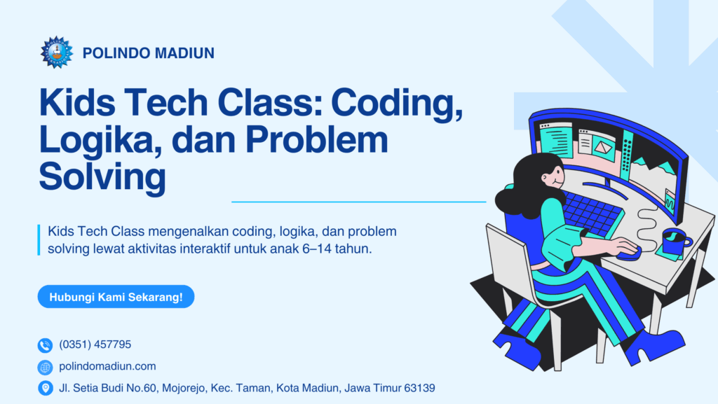 Kids Tech Class mengajarkan anak berpikir sistematis dan menyelesaikan masalah melalui coding. Program ini menempatkan problem solving sebagai inti pembelajaran sehingga setiap aktivitas mendorong peserta mencari solusi. Anak diajak melihat masalah sebagai tantangan yang dapat dipecah menjadi langkah‑langkah kecil dan diselesaikan satu per satu.