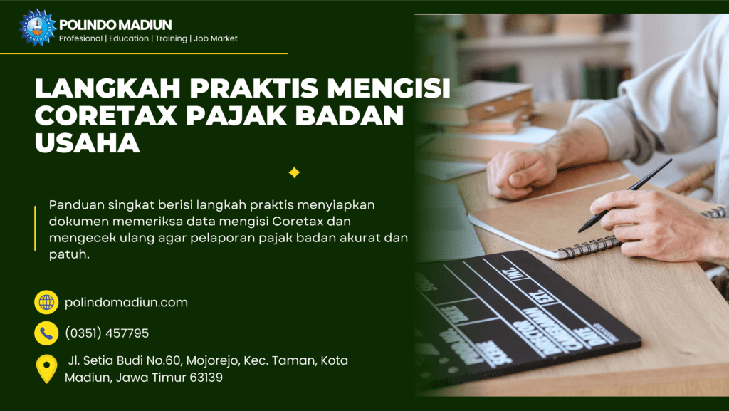 Dengan pembukuan yang rapi dan langkah pengisian yang sistematis badan usaha akan memenuhi kewajiban pajak lebih mudah. Oleh karena itu latih tim keuangan melalui pelatihan praktis, studi kasus nyata, dan simulasi pengisian SPT badan. Untuk itu ikuti kursus pajak badan usaha di Kampus Polindo Madiun.